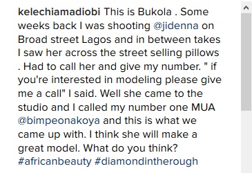 "This is Bukola . Some weeks back I was shooting @jidenna on Broad street Lagos and in between takes I saw her across the street selling pillows . Had to call her and give my number. ” if you’re interested in modeling please give me a call” I said. Well she came to the studio and I called my number one MUA @bimpeonakoya and this is what we came up with. I think she will make a great model. What do you think? #africanbeauty #diamondintherough”