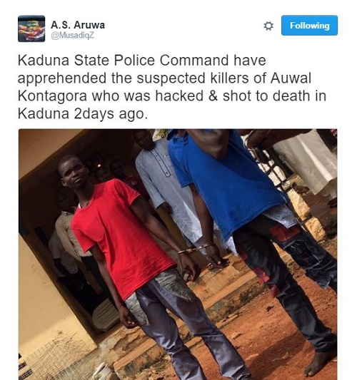 The Kaduna State Police Command said Auwal Kontagora was hacked and shot to death in Kaduna State two days ago by the suspects.
