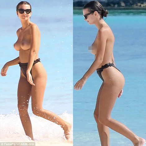According to Dailymail, Emily who is currently enjoying a holiday in Cancun, Mexico with her friends, confidently showed off every inch of her all-natural gorgeous figure on the beach when she removed her black swimsuit  top of as she soaked up the sun.