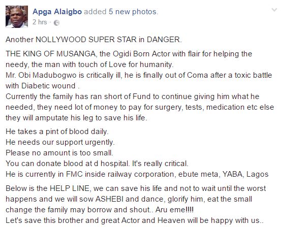 Veteran Nollywood actor and producer, Obi Madubogwu is critically ill, following a protracted battle with a diabetic wound.